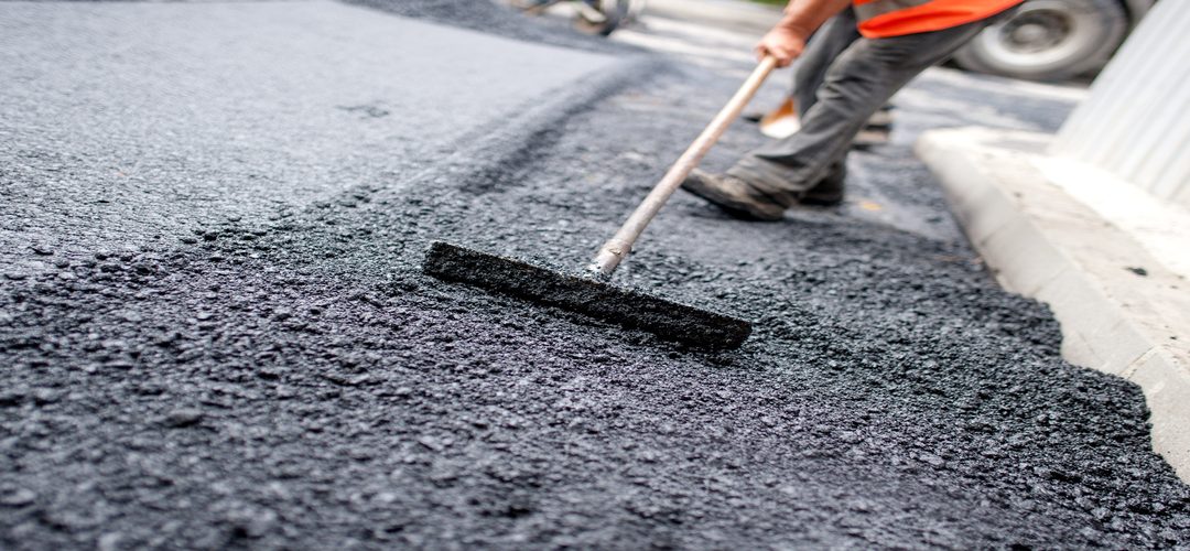 Worker levelling fresh asphalt on a road construction site, indu